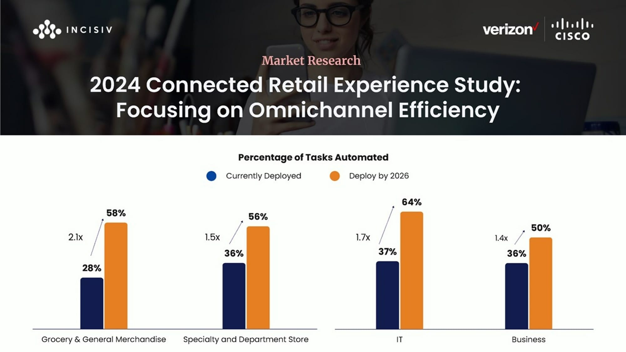 NEW YORK — The 2024 Connected Retail Experience Study: Focusing on Omnichannel Efficiency by Incisiv, conducted in collaboration with Verizon and Cisco, shows that retailers are actively seeking innovative technologies to revolutionize store efficiency, mitigate increasing retail theft, and address critical labor shortages.
