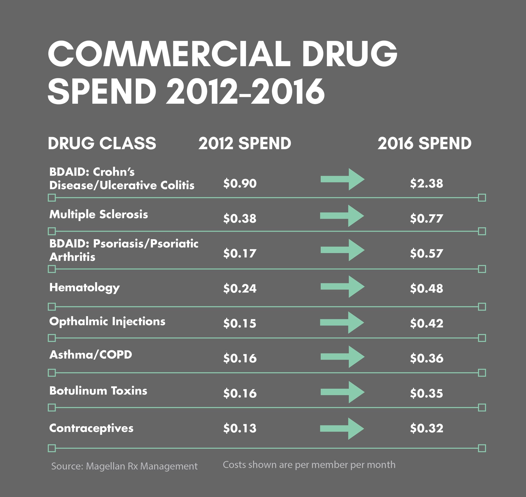 It is important to remember that the list price of a drug often has little to do with payer willingness to facilitate access to a specific therapy, particularly in the branded space. All plans have allocated medical and pharmacy budgets. Payers determine these budgets by looking at various therapeutic areas to determine how much to allocate for each individual person, referred to as the price per member per month (PMPM). If a payer has $1 billion to spend annually on rheumatoid arthritis (RA) with 10 million plan lives, the PMPM allocation for RA is $100. From a payer’s perspective, the current focus is products with exceptional PMPM growth.