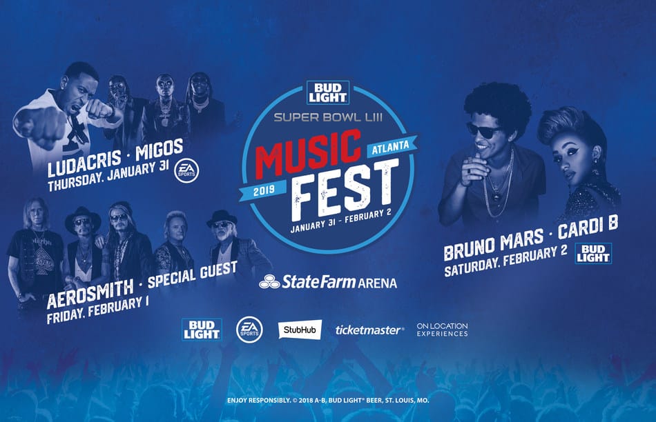 The three-night festival will give football fans and the entire city of Atlanta an opportunity to enjoy the artists they love from Thursday, January 31 through Saturday, February 2 at Atlanta’s fully transformed, premium, sports and live entertainment venue State Farm Arena. On Saturday Night, the Bud Light Super Bowl Eve concert will feature one of the world’s biggest pop artists Bruno Mars and one of the top female rappers in the game Cardi B. Friday’s lineup includes Rock and Roll Hall of Famers Aerosmith and soon-to-be-announced special guest.