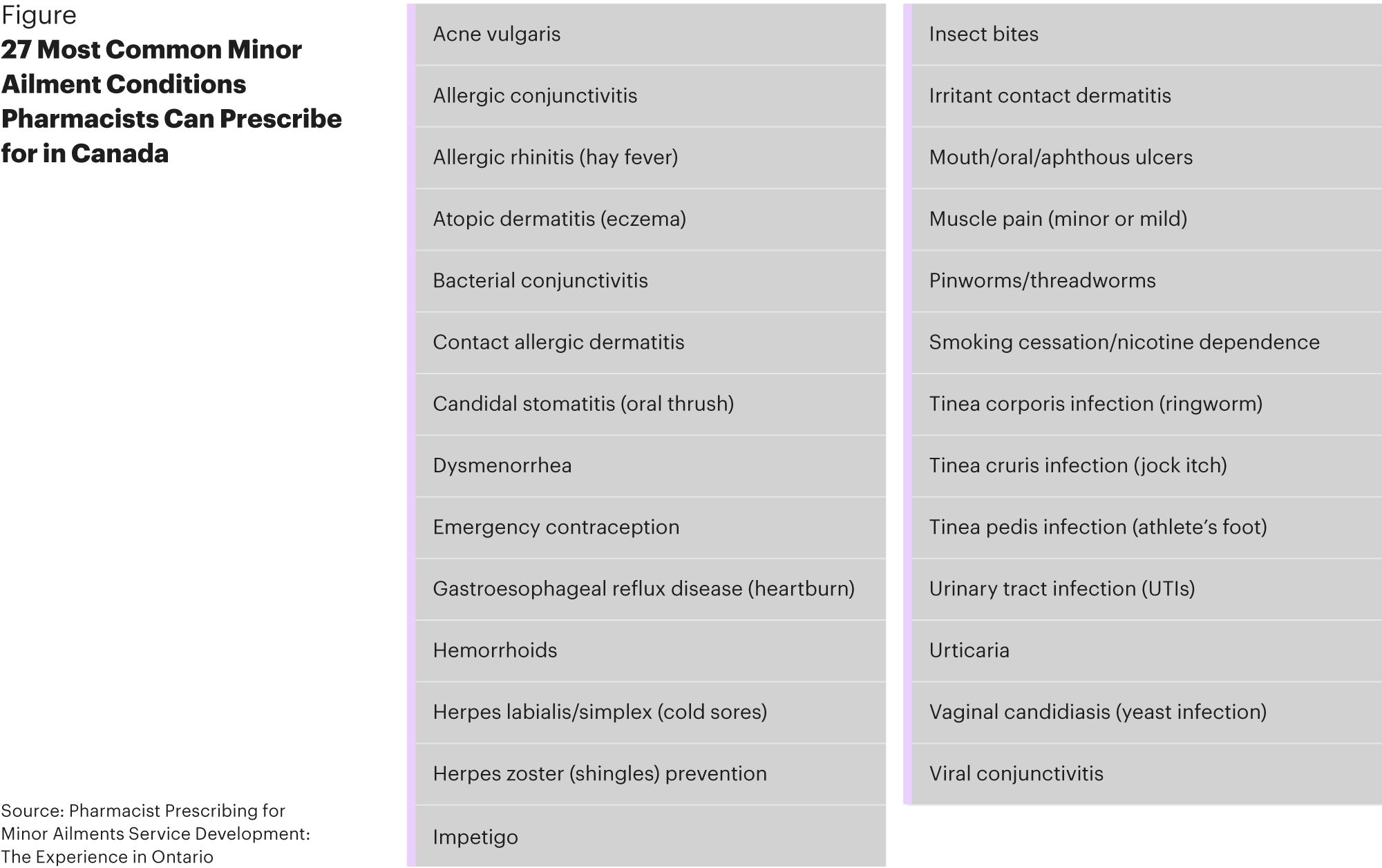 You don’t have to look far to see a different approach to treating minor ailments. Canada has been on a journey to shift treatment for minor ailments to pharmacists with significant progress and traction in recent years. As of the beginning of this year, the country’s most populous province, Ontario, followed other provinces in allowing pharmacists to prescribe drugs for minor ailments (see figure 1 above) including hay fever, pink eye, menstrual cramps, and urinary tract infections. As of today, most provinces have expanded scope or are running pilots with intent to scale. With popular acceptance and further expansion being contemplated, including management of chronic conditions, Canada is a compelling case study for improving patient experience, increasing healthcare system efficiency, and expanding health access and equity for the United States and other countries.