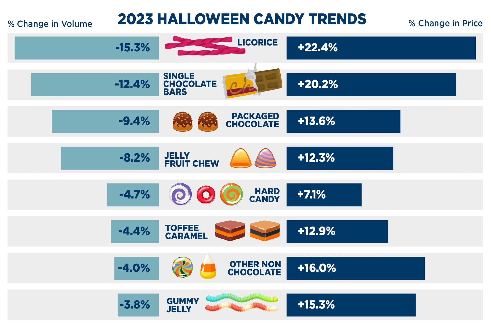 The candy types with unit sales decreasing the most since this time last year are Licorice (-15%), followed by Single Chocolate Bars (-12%), Packaged Chocolate (-9%), and Fruit Chew Candies (-8%). The categories with the greatest unit sales decreases – Licorice and Single Chocolate Bars – also saw the greatest price increases at +22% and 20% respectively.