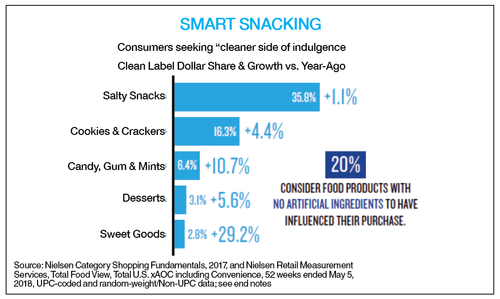 Instead, opportunities for growth in snacking sit at the corner of healthy and indulgent. The path to this middle ground of good and bad is guided by transparent products manufactured in simple, sustainable and clean ways. Where consumers can feel reassured that they are avoiding undesirable or artificial ingredients, they can be enticed to treat themselves. In fact, “clean” products are driving outsized growth across many indulgent snack categories.