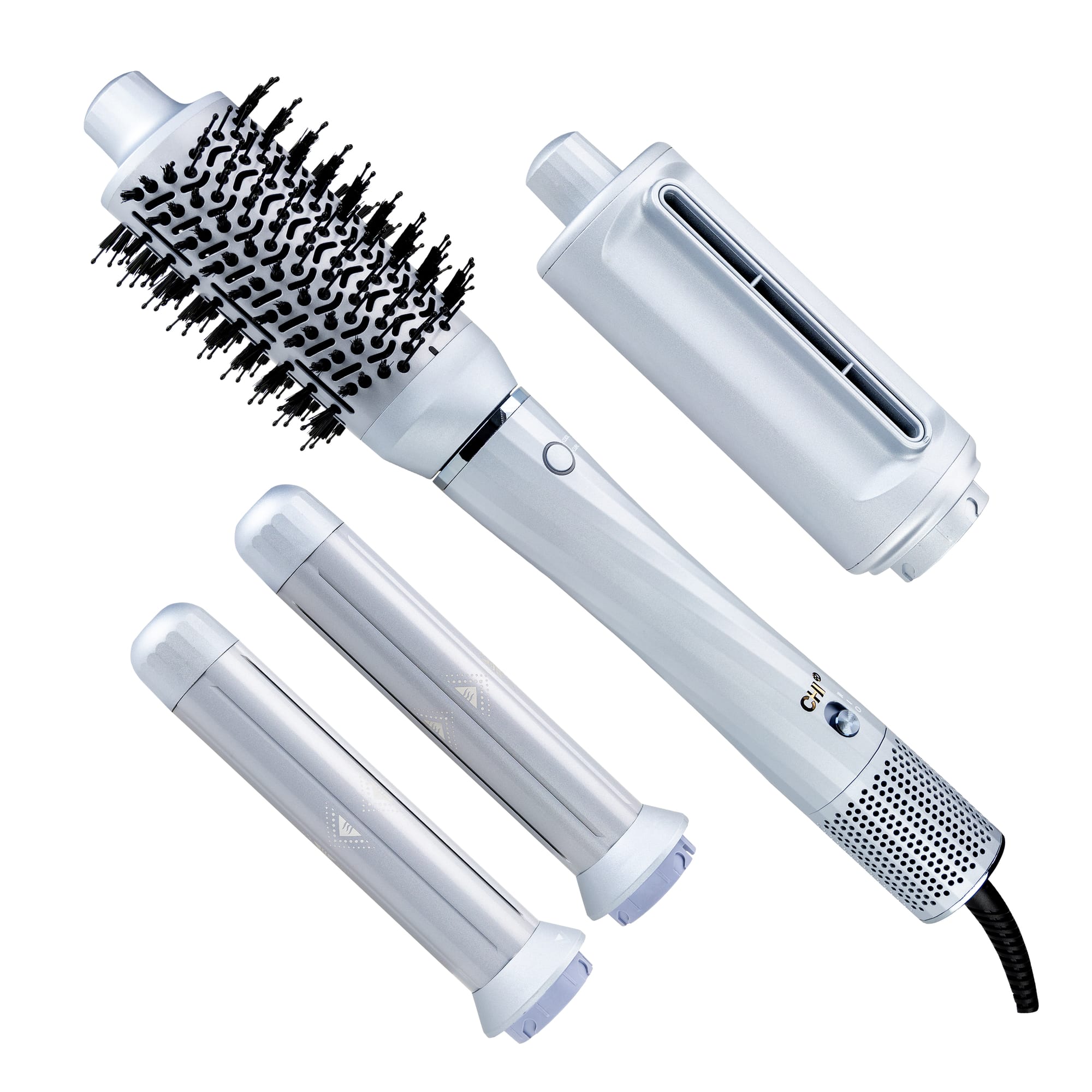 The 4-in-1 Styler features auto-wrap curlers, an oval brush, and a quick-dry nozzle, providing versatile styling options. The hair dryer features anti-static technology, antimicrobial LED light, and multiple attachments, while the flat iron offers adjustable temperatures up to 450°F, dual voltage, and a sleek ceramic finish for smooth, long-lasting styles.
