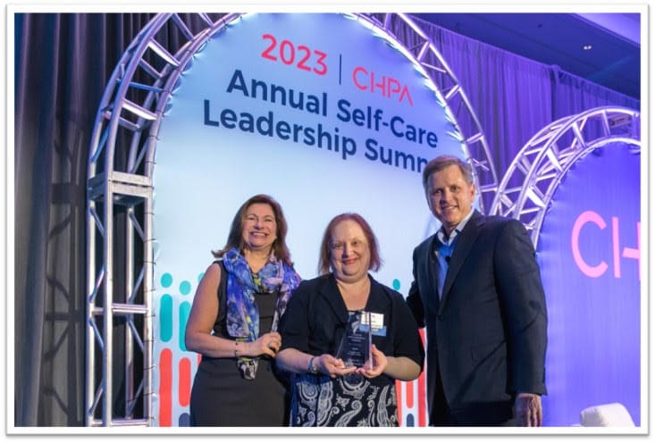 CHPA’s Regulatory & Scientific Affairs Career Achievement Award was established in 2022 to recognize individuals who have created a long-lasting impact in support of public health via self-care throughout their career of at least 20 years. These individuals have applied their expertise in many ways; for example, to enable new products and technologies, to help shape a constructive regulatory environment, or to develop new research techniques. They are recognized across the industry as leaders in their field who have devoted time to recruiting, training, and mentoring future experts. This year’s award was presented to Dr. Kochanowski by CHPA President and CEO Scott Melville and Haleon’s Vice President of U.S. Regulatory Affairs and Chair of CHPA’s Regulatory & Scientific Affairs Committee Lauren Quinn.