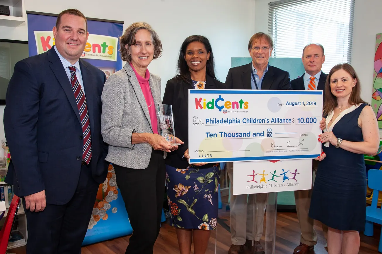 From left, Bryan Everett, chief operating officer of Rite Aid and president of The Rite Aid Foundation Board of Directors; Chris Kirchner, executive director of the Philadelphia Children’s Alliance and KidChamp Award recipient; Tracy Henderson, director of The Rite Aid Foundation and charitable giving initiatives; Mark Kramer, Rite Aid divisional senior vice president; David Mahan, Rite Aid regional vice president and Margherita Cardello, Rite Aid divisional vice president.