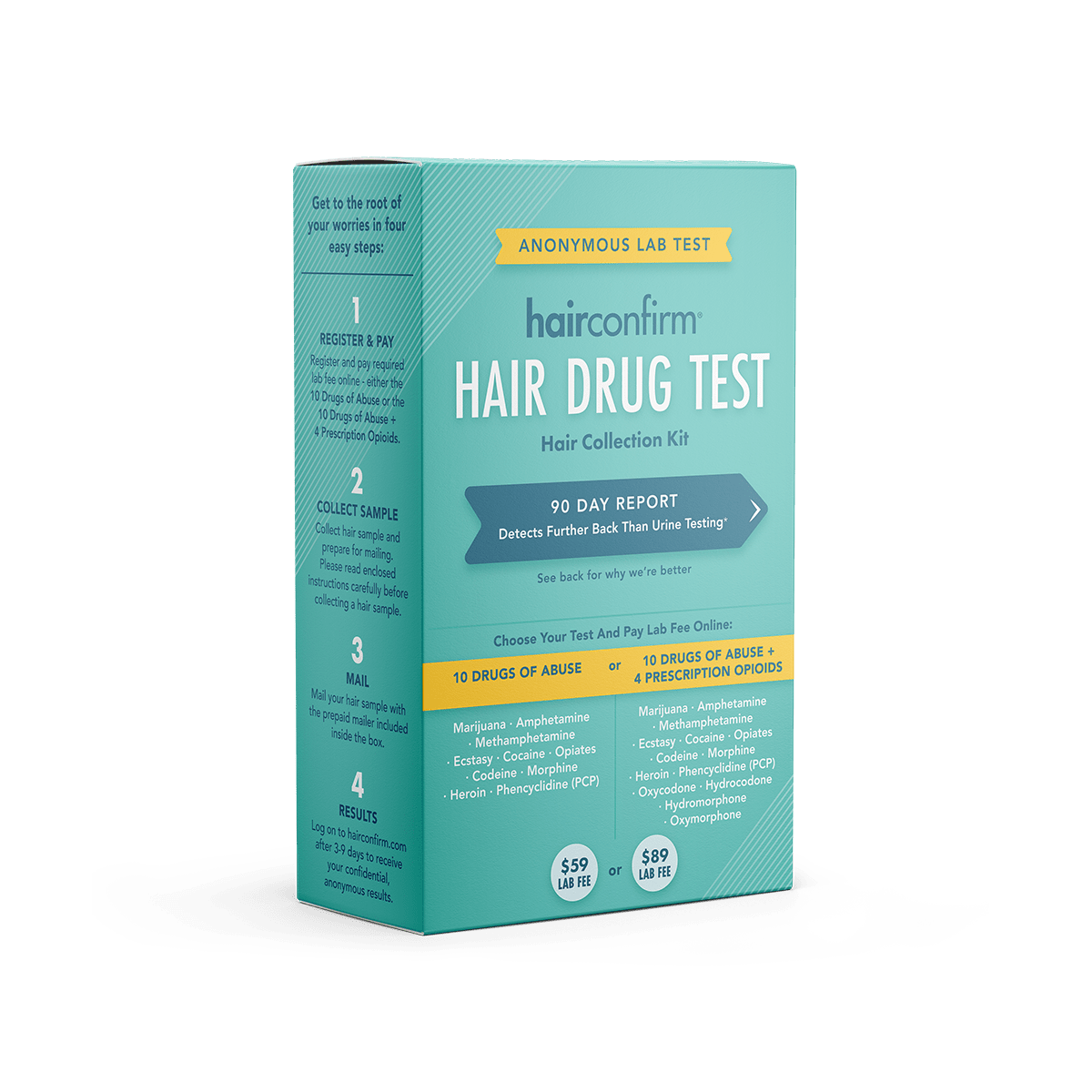 HairConfirm offers the latest technology that accurately tests up to 14 drugs of abuse using hair. The all-inclusive hair follicle kit accurately screens for 10 illicit substances: Marijuana, Amphetamines, Methamphetamine, Ecstasy, Cocaine, Opiates, Codeine, Morphine, Heroin, Phencyclidine (PCP), plus 4 prescription drugs: Oxycodone, Hydrocodone, Hydromorphone, Oxymorphone.
