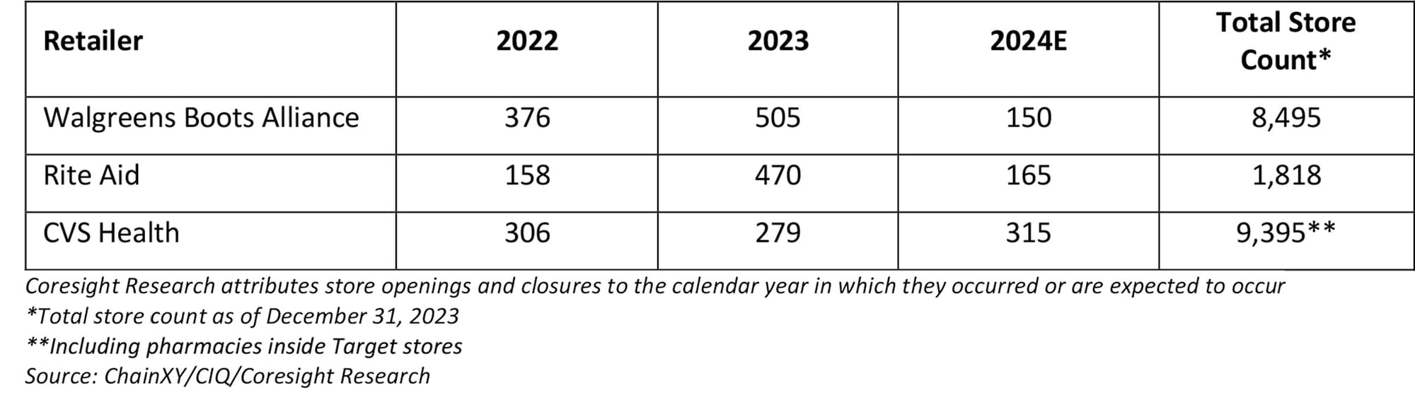 • In 2021, CVS stated that it would close 900 stores by the end of 2024, representing about 10% of its total fleet. The retailer stated in February 2024 that it has closed 630 of these so far and is on track to reach its target. CVS also announced in January 2024 that it will close some of its pharmacies operating in Target stores by April 2024.