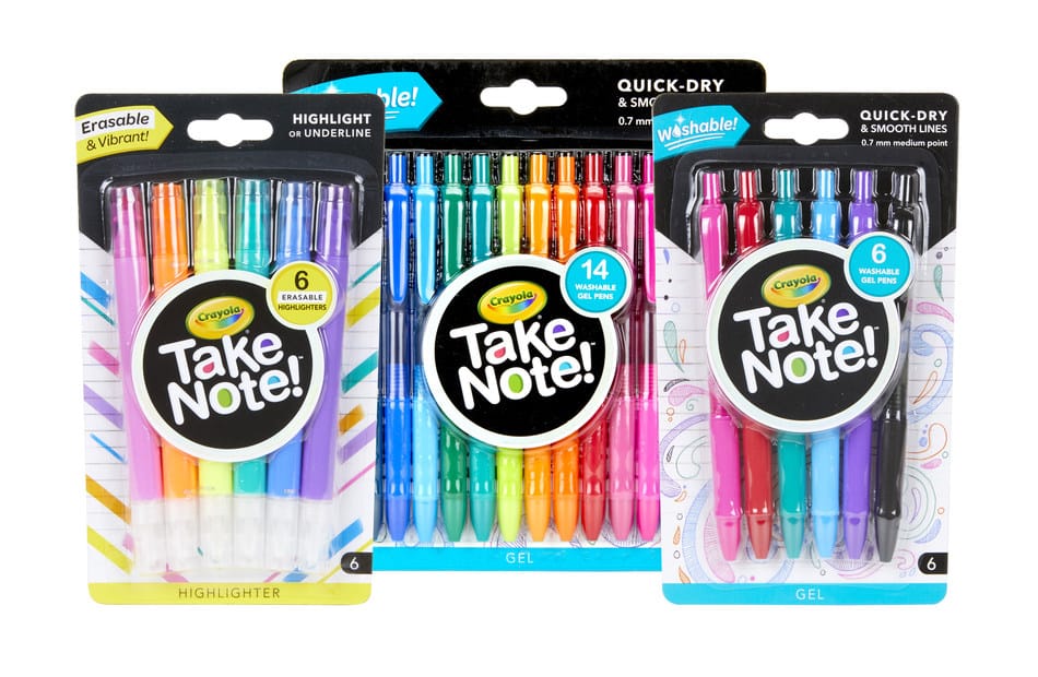 ASTON, Pa. — Just in time for the new school year, Crayola is launching Take Note! – a new, colorful line of creative writing tools for teens and tweens. The line consists of Washable Gel Pens and Erasable Highlighters in a range of bold colors that inspires students to make colorful marks on notes, homework, art projects and journaling.