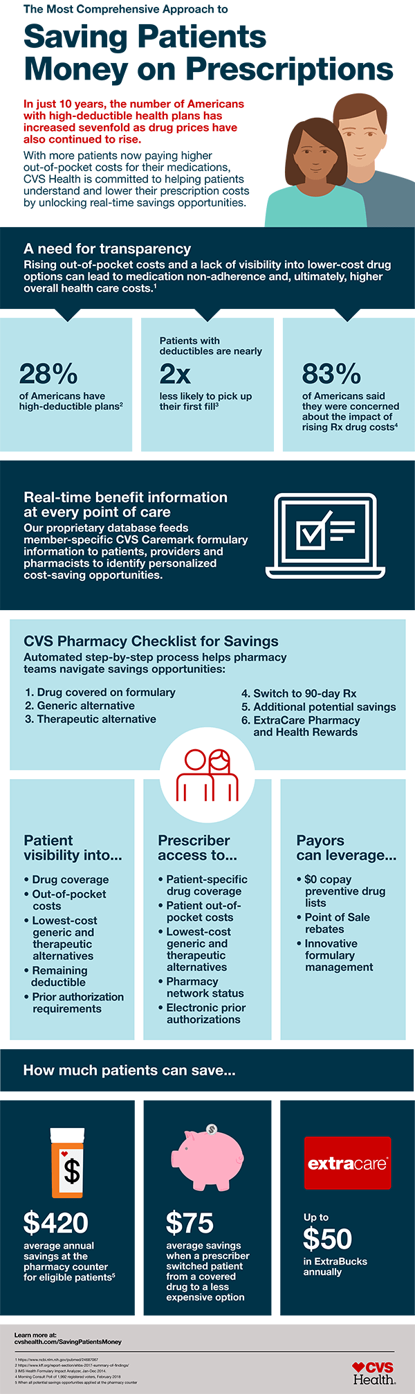 “Today’s consumers are faced with higher prescription drug prices than ever before, and many of them are now paying for a larger share of their prescription drug costs out of their own pockets at the pharmacy counter due to growth in high-deductible health plans,” says Thomas Moriarty, chief policy and external affairs officer of CVS Health. “Until now, patients haven’t had the appropriate tools available to them to help them manage these costs. To address this, CVS Health is giving expanded tools to patients, prescribers and pharmacists so they can evaluate prescription drug coverage in real time and identify lower-cost alternatives.