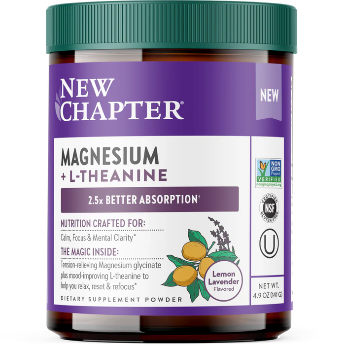 Enter New Chapter Magnesium + L‑Theanine Powder. This daily powder blend combines clinical strength L-theanine – an amino acid known for promoting calm focus – with tension-relieving magnesium – a mineral essential for nervous system balance, muscle relaxation and healthy stress response. The result? A simple, lemon-lavender flavored drink you can mix into your day or evening ritual to help soothe tension and reset your rhythm.