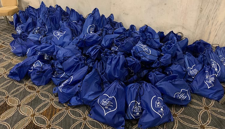 “WELCOME FAMILY drawstring bags” filled with generous donations from Emerson Clients that included oral care and personal care items.