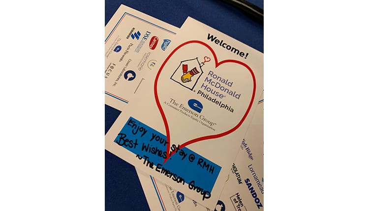 PHILADELPHIA — The Emerson Group recently donated its time and money to the Philadelphia Ronald McDonald House (PRMH) and worked together (clients, colleagues and Emerson employees) to fill “WELCOME FAMILY drawstring bags” filled with generous donations from Emerson clients that included oral care and personal care items. They also included a personalized Welcome to RMH card and a family activity. In addition, Emerson donated two large family Jenga games for the facility as well as a $50,000 donation.