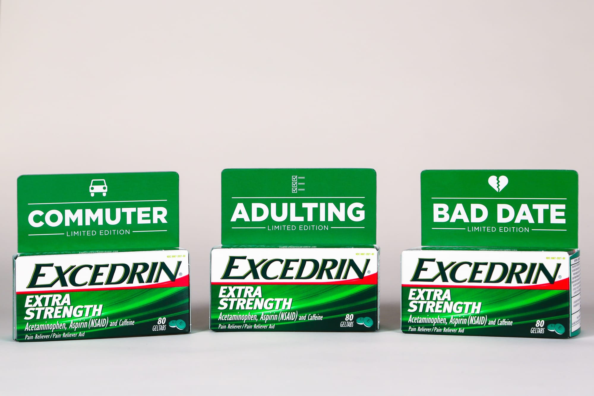 WARREN, N.J. — The millions of people who experience headaches associated with commuting, dating or adulting finally have a Limited Edition pain reliever to call their own. Starting today, Excedrin is launching three special edition versions of its popular Excedrin pain reliever, including “Commuter Edition,” “Bad Date Edition” and “Adulting Edition,” to bring relief where it’s needed most. These Limited Editions are available exclusively at Excedrin.com while supplies last.