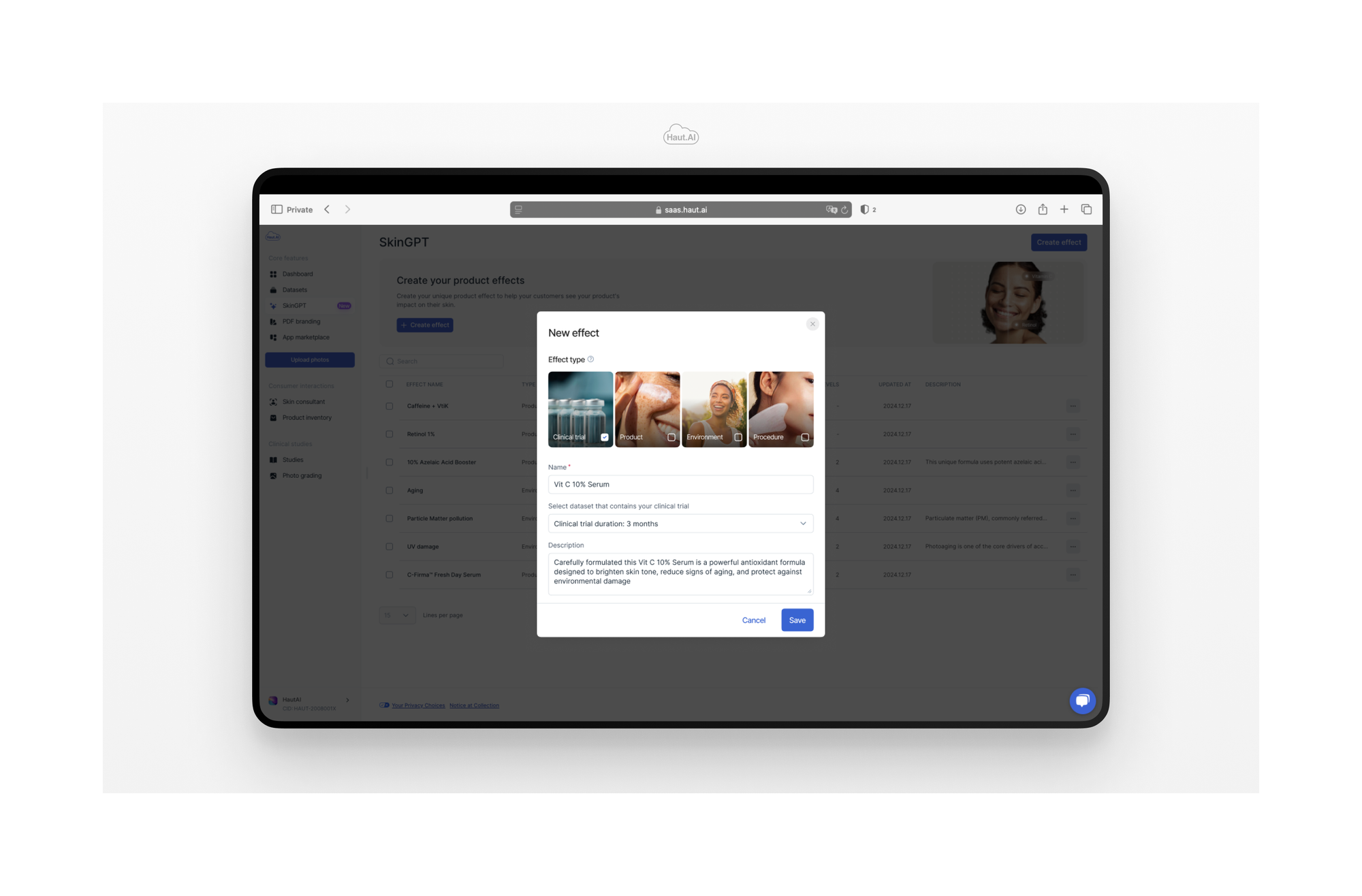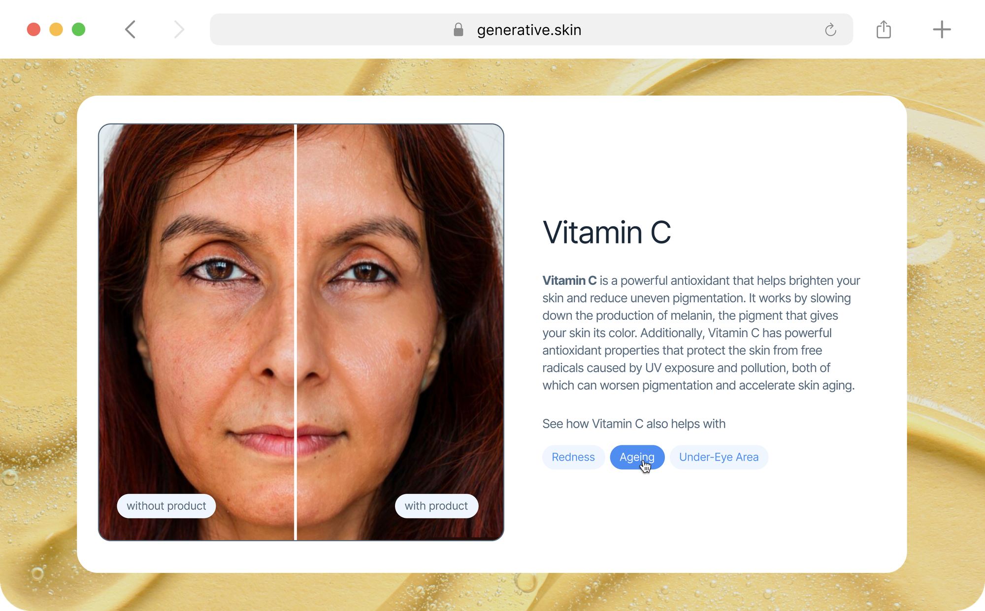 Generative.Skin is the world’s first interactive AI-powered skincare ingredient simulator. Built to democratize access to scientific skincare insights, users can visualize how individual ingredients might impact their skin’s appearance. Haut.AI plans to expand the platform regularly with new ingredients and data, building a comprehensive library showcasing both skincare components' positive and adverse effects.