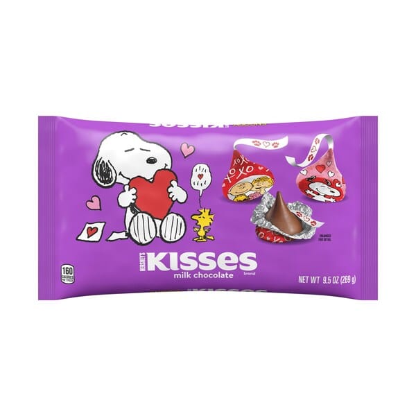 - Hershey’s Kisses Milk Chocolates with Snoopy & Friends Foils (9.5 oz. bag): Brand new Hershey’s Kisses Milk Chocolate with Snoopy & Friends Foils feature 18 pink and red designs of Snoopy and his pals, including beloved characters like Woodstock, Charlie Brown and Lucy. Show affection this Valentine’s Day with these Kisses candies, available nationwide for a limited time only in 9.5 oz. bags.