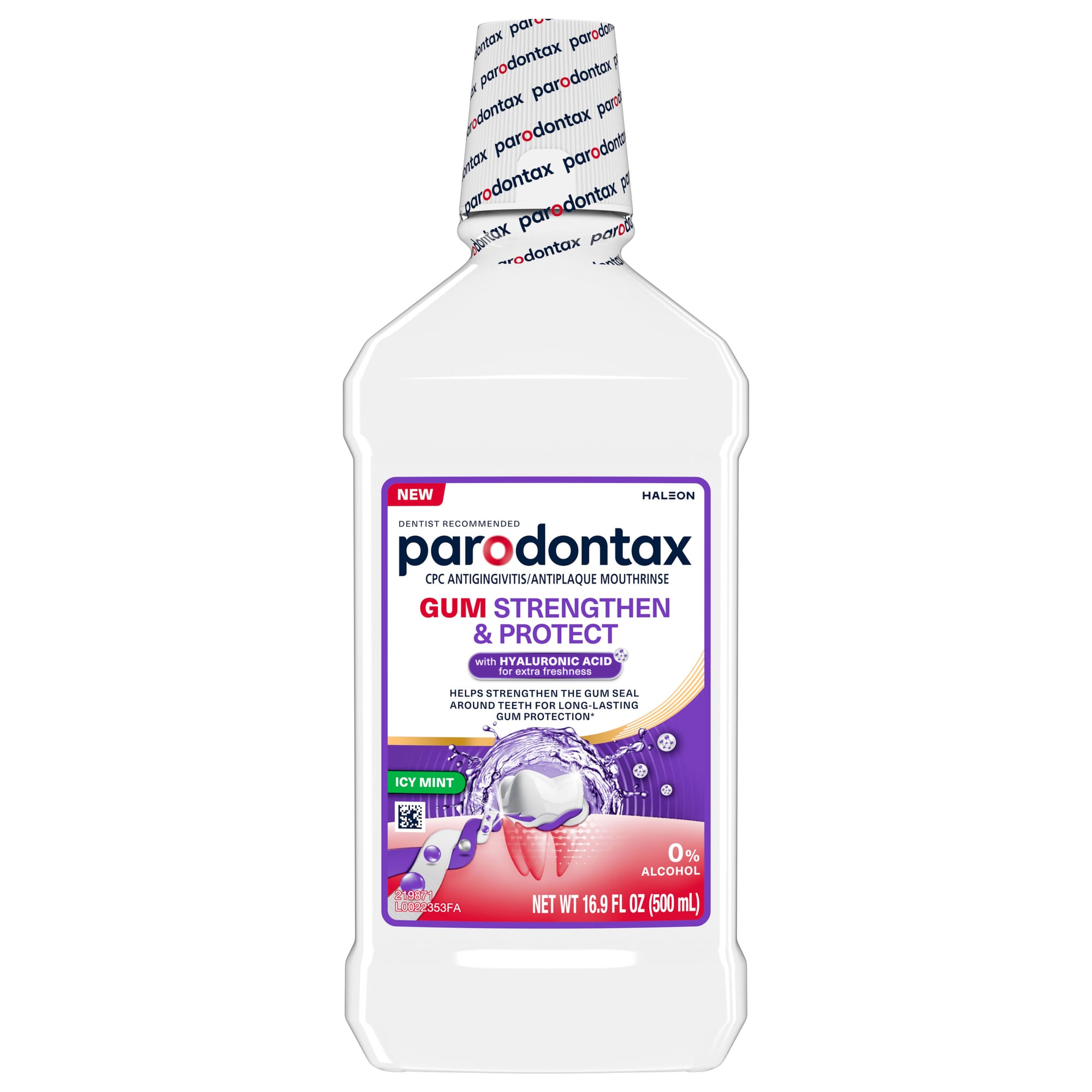 - Icy Mint Mouthwash — Formulated with hyaluronic acid for extra freshness, this alcohol-free mouthwash kills plaque bacteria along the gumline to support a stronger, tighter seal between gums and teeth.