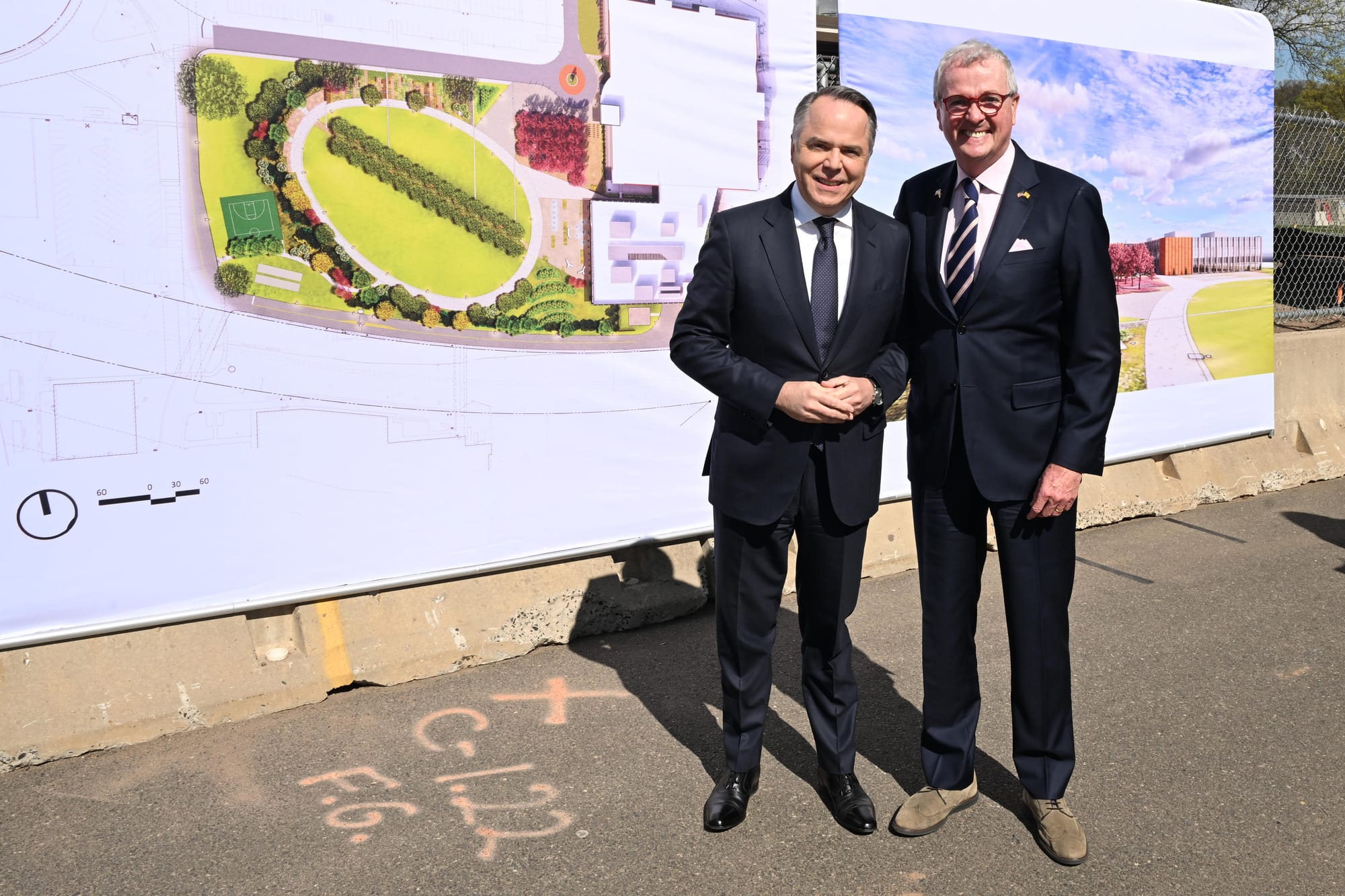 (L-R) CEO of Kenvue, Thibaut Mongon and Governor of New Jersey, Phil Murphy attend the Kenvue Ground Breaking in Summit, NJ on April 24, 2024 in Summit, New Jersey. (Photo by Dave Kotinsky/Getty Images)