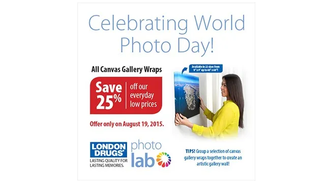 Also as part of the World Photo Day promotion, the London Drugs Photolab is offering 25% off all canvas gallery wrap orders on Aug. 19.