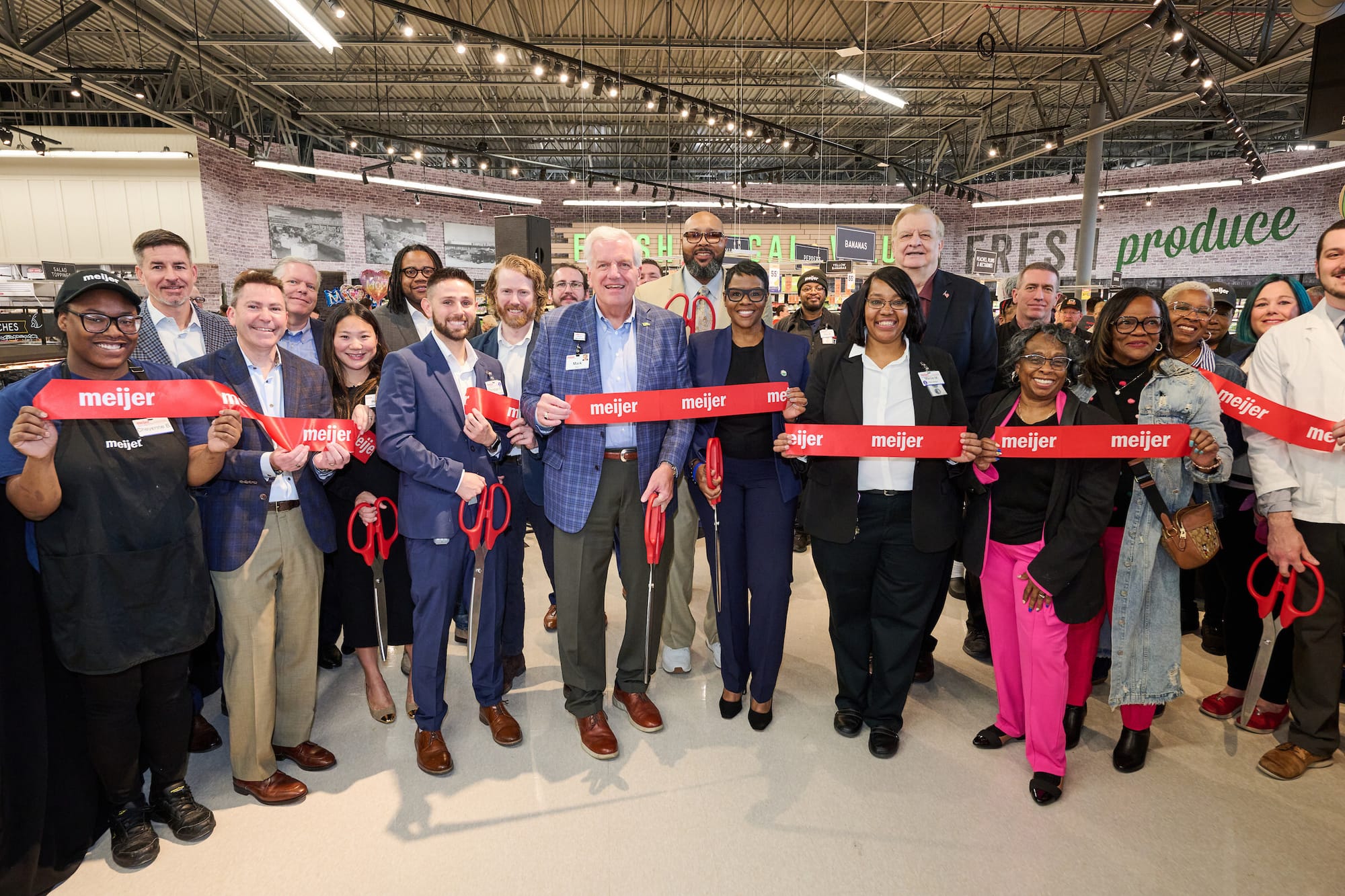 Meijer Store Directors Patrick Hughes, Carol Lester, and Marcella Mathis and their teams welcomed customers into the stores with a round of applause when the doors opened. This was later followed by ribbon-cutting events attended by Keyes and members of the Meijer family.