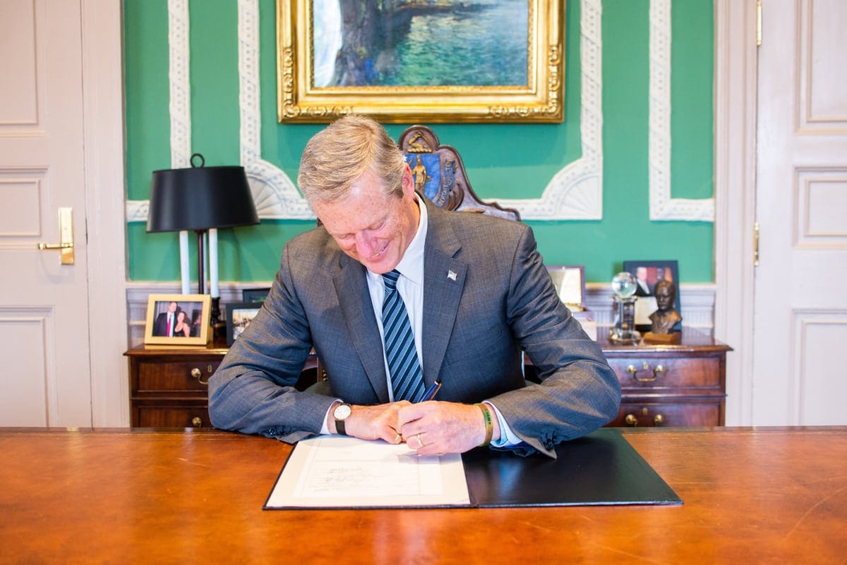 Shown here signing other legislation, Massachusetts Governor Charlie Baker (R) on August 9, 2018, signed House Bill 4742, which requires that on or after January 1, 2020, prescriptions for Schedule II through VI controlled substances in the Commonwealth of Massachusetts must be issued as an electronic prescription from the person issuing the prescription to a pharmacy.