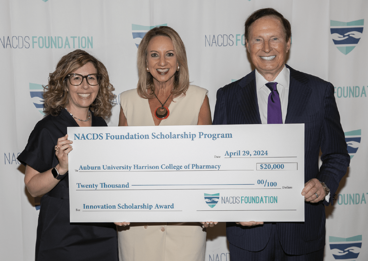NACDS Foundation Chairman of the Board Steven C. Anderson (right) and NACDS Foundation President Sara Roszak (left) present an innovation-focused award to Auburn University Harrison College of Pharmacy. Dean Leigh Ann Ross (middle) accepted the award at the NACDS Foundation event on April 29.