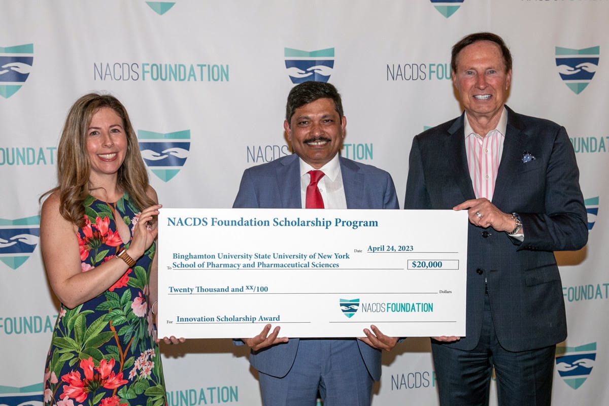 NACDS Foundation Chairman of the Board Steven Anderson (left) and NACDS Foundation President Sara Roszak (right) present an innovation-focused award to the Binghamton University State University of New York School of Pharmacy and Pharmaceutical Sciences. Dean Kanneboyina Nagaraju (middle) accepted the award at the NACDS Foundation event on April 24.