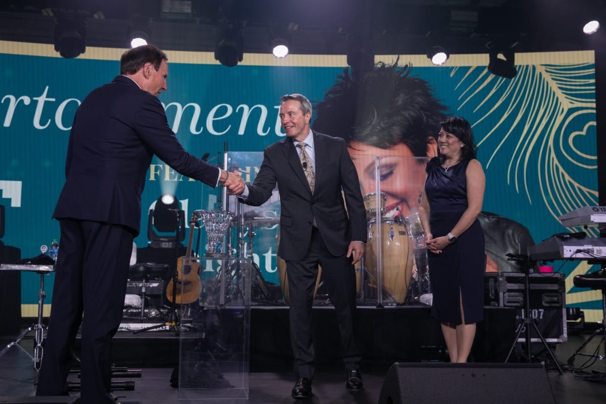 NACDS President and CEO Steven C. Anderson (left) presents NACDS Past Chair John Standley (right) and his wife, Annie, with the 2023 Sheldon W. Fantle Lifetime Achievement Award on the final evening of the NACDS Annual Meeting.
