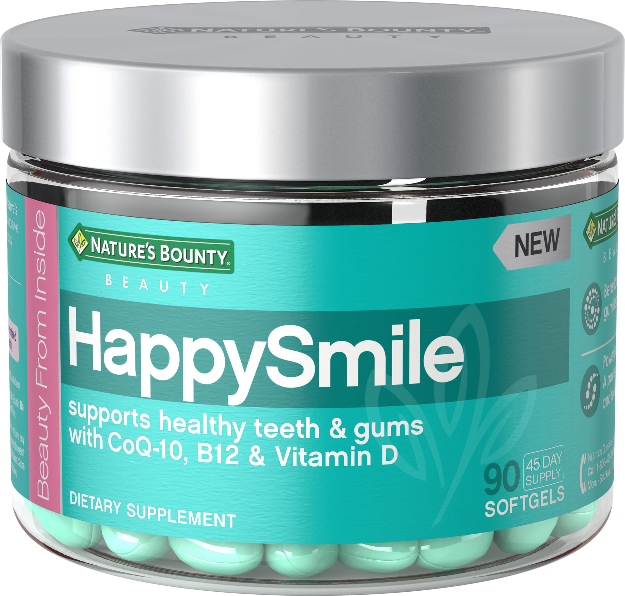 • HappySmile: Nature’s Bounty HappySmile Beauty Gels contain CoQ-10 to promote oral health from the inside, out. The innovative, preservative-free formula also includes Vitamin B-12 and Vitamin D, a power duo that supports healthy gums and teeth.