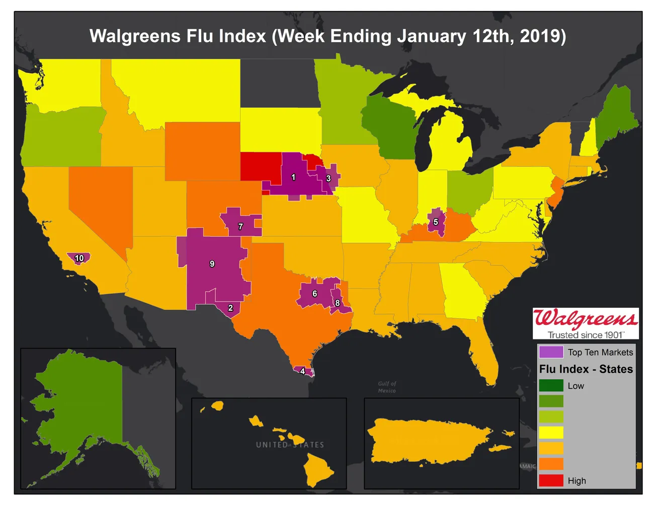 DEERFIELD, Ill. — Nebraska, New Mexico and Kentucky are in the top slots for State Flu Activity in Walgreens Flu Index for the week ending January 12, 2019. The Walgreens Flu Index is a weekly report developed to provide state- and market-specific information regarding flu activity, and ranks those states and markets experiencing the highest incidences of influenza across the country.
