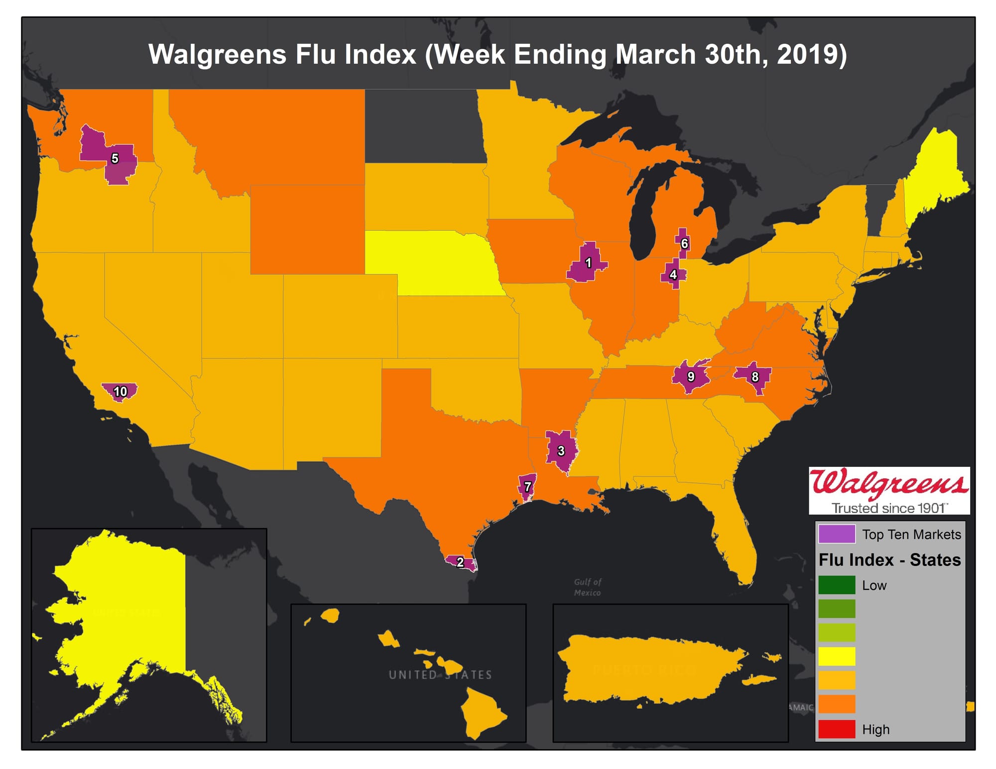 The Walgreens Flu Index is compiled using the drugstore chain’s weekly retail prescription data for antiviral medications used to treat influenza across Walgreens and Duane Reade locations nationwide. In addition to the top markets and states, the Flu Index also ranks the markets and states experiencing the greatest gains in activity on a week-over-week basis.