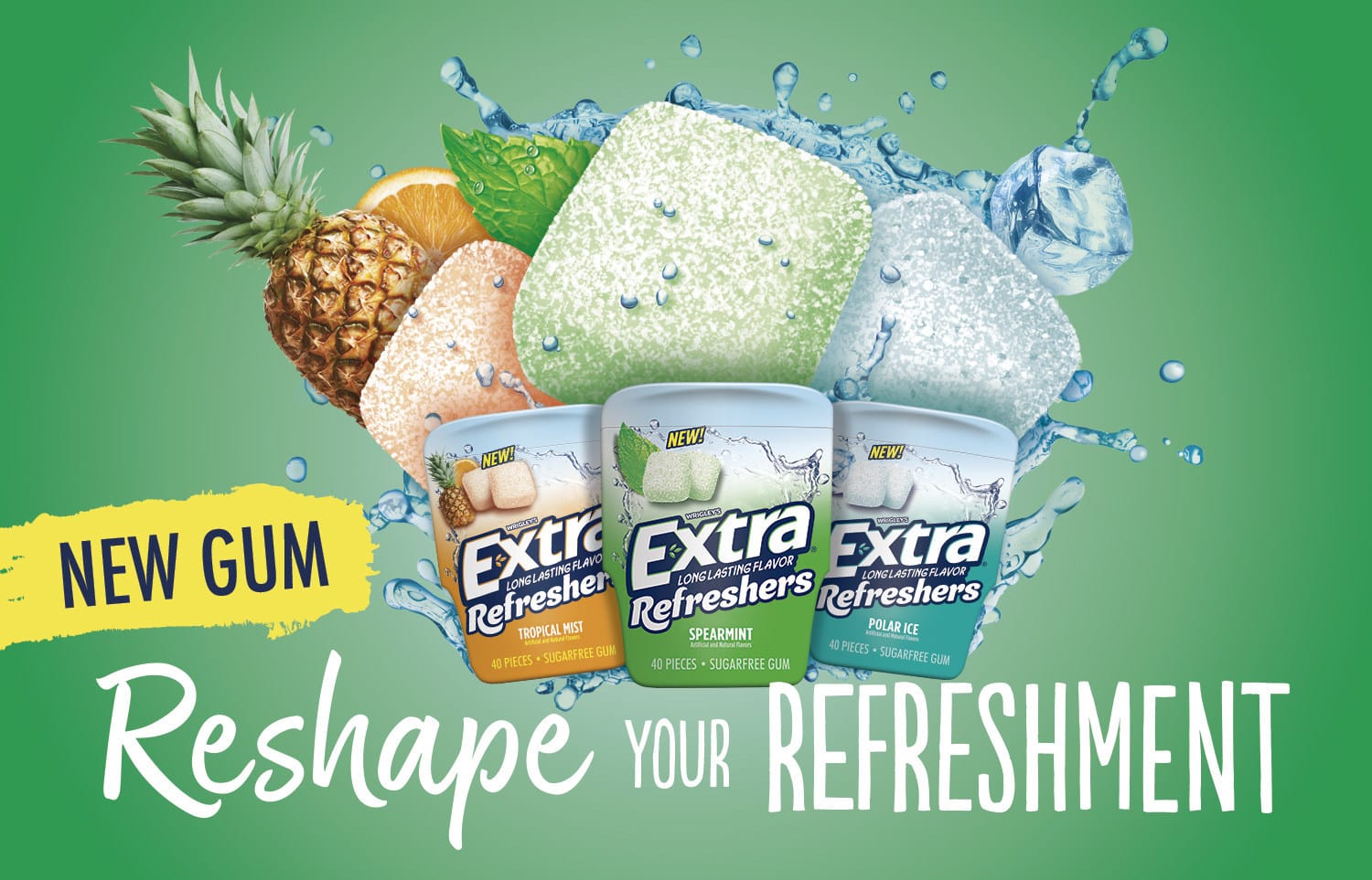 Extra Refreshers gum is now available at Walmart stores and will roll out to additional retailers nationwide in late April. Available pack types include a 40-Count Bottle (MSRP $3.49) and a 9.65oz 120-Count Stand Up Pouch (MSRP $7.69). The new product launch will be supported with a full-scale marketing campaign this spring, including TV, print, online, PR and in-store support.