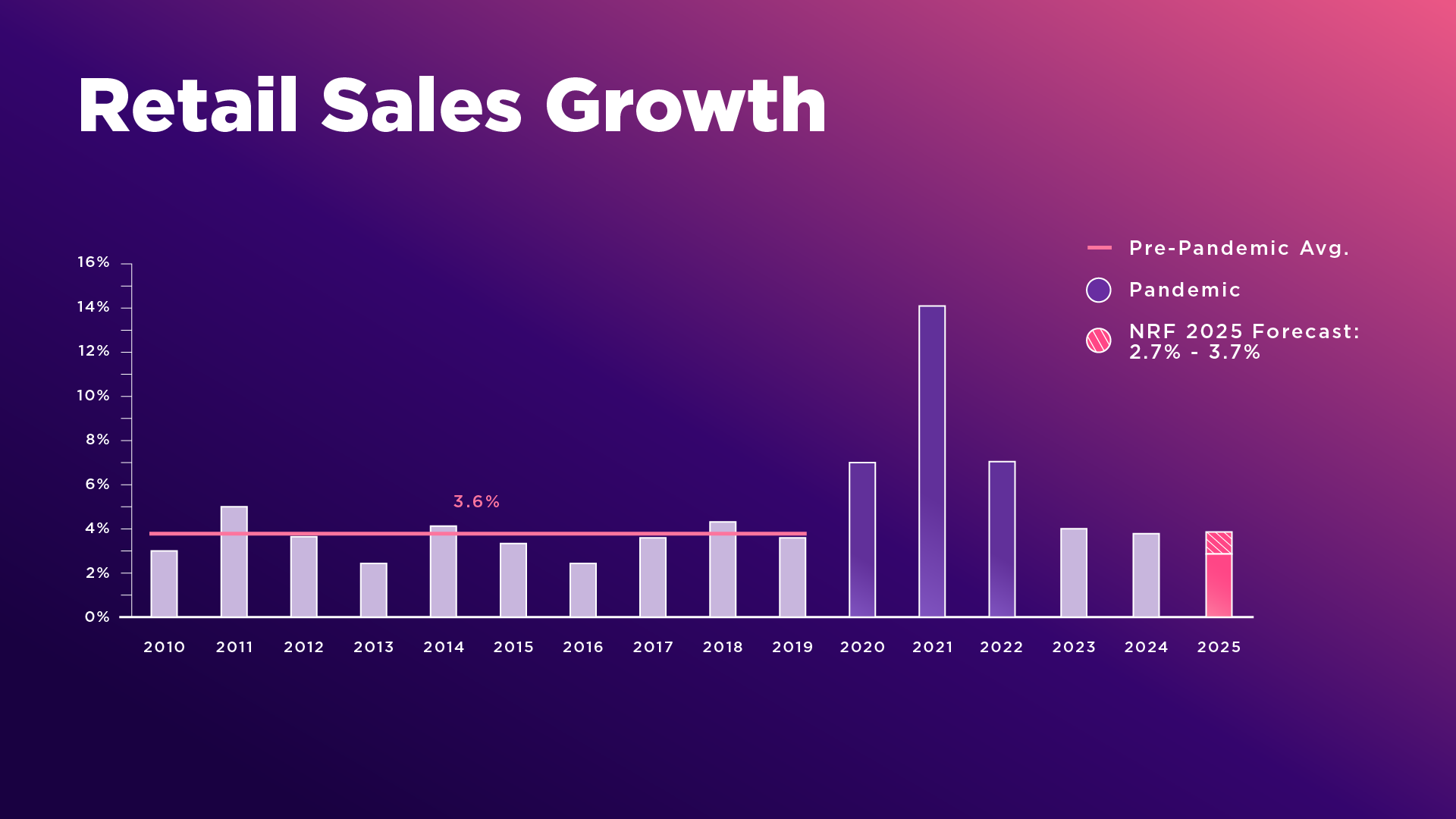 The 2025 sales forecast compares with 3.6% annual sales growth of $5.29 trillion dollars in 2024. This year’s forecast is also in line with the 10-year pre-pandemic average annual sales growth of 3.6%.