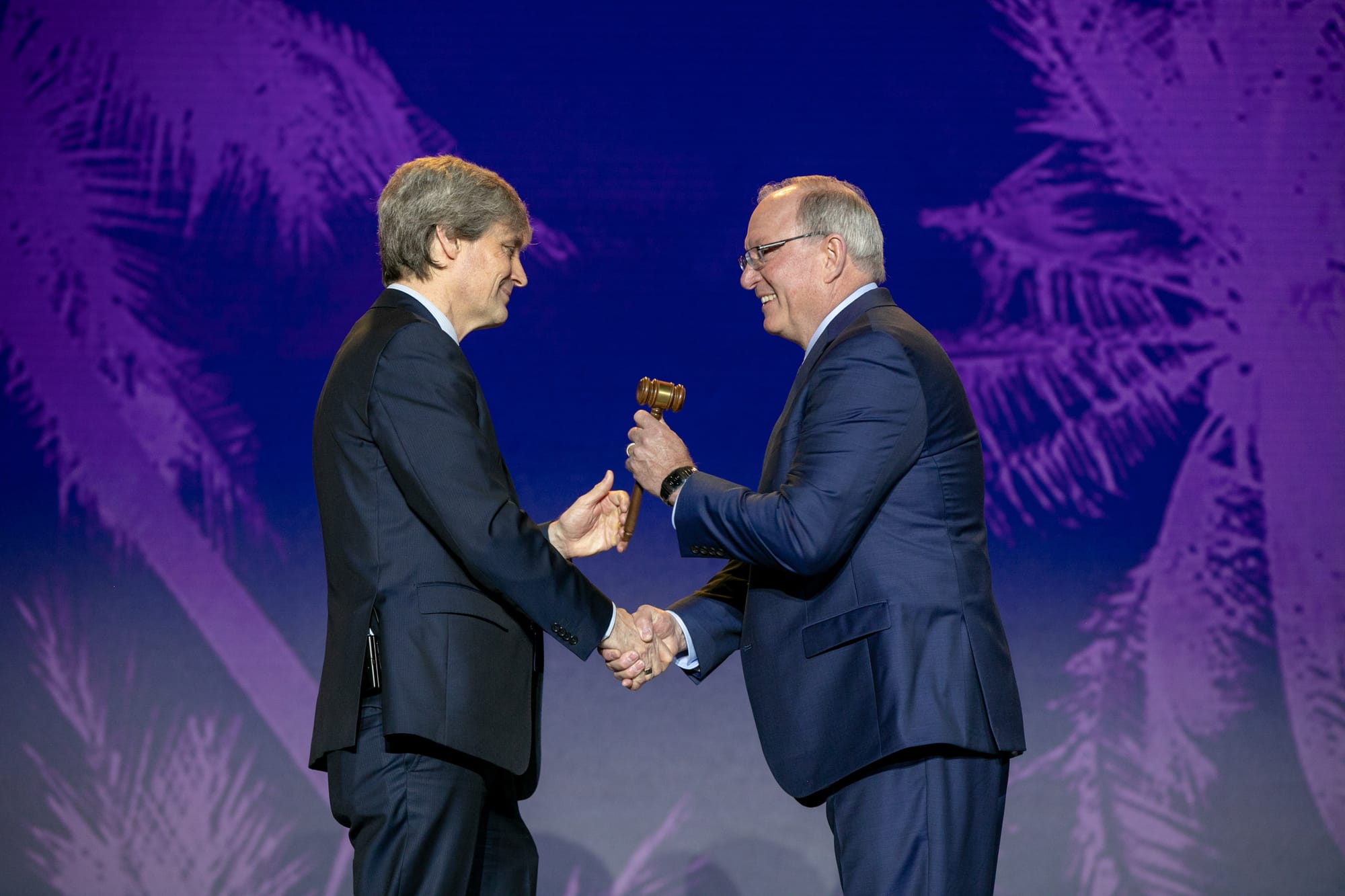 Panzer, right, takes the chairman’s gavel from Alex Gourlay