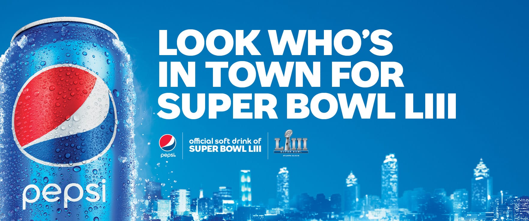 - Pepsi Paints Atlanta Blue: Pepsi has painted Atlanta blue, with over 350 pieces of outdoor advertising across the city, celebrating the brands arrival as the official soft drink of Super Bowl LIII. Fans and locals alike will see proud Pepsi blue messaging blanketing stores, on billboards, on recycling bins, at train stations, and even projection mapped on hotels and at and around the stadium. Pepsi pour restaurant locations all around town have been outfitted to wear their “blue” and are offering a number of special promotions and giveaway opportunities for consumers, including giving away Pepsi Super Bowl LIII Halftime Show sideline passes and game tickets.