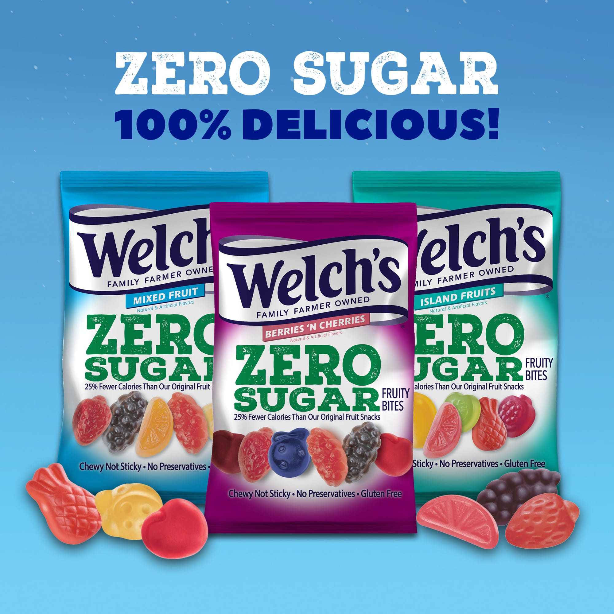 Welch’s ZERO SUGAR Fruity Bites are chewy, fruity, delicious, and 100% sugar-free, with 25% fewer calories than the original Welch’s Fruit Snacks but all the great taste. The new treats are fat-free, gluten-free, aspartame-free, and contain no preservatives.