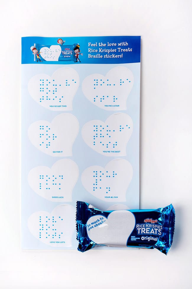 The ‘Love Notes’ Braille stickers are heart-shaped to match the space on Rice Krispies Treats writable wrappers for written notes. Each Braille sticker sheet also includes eight uplifting phrases for parents to share with their children, from “You’ve Got This” to “Love You Lots.”