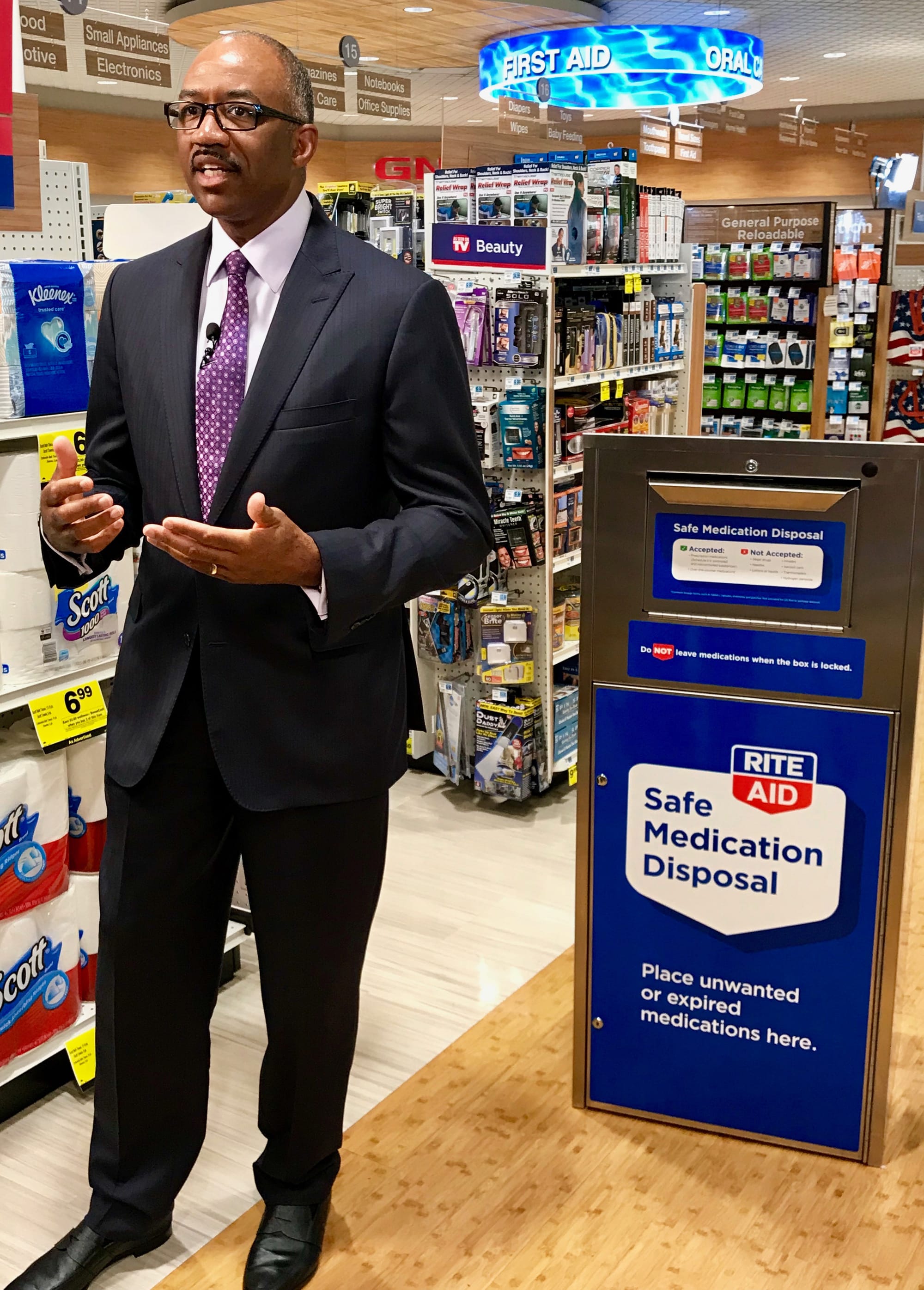 Rite Aid president and chief operating officer Kermit Crawford joined Rep. Scott Perry (R., Pa.) to officially unveil the company’s first in-store medication disposal unit at a press event held at the Rite Aid pharmacy in Lemoyne, Pa.