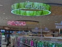 The new, contemporary decor and signage include ceiling ring signs designate each section of the store — such as beauty, food, home care, wellness and seasonal — as well as lighting fixtures and brand headers across the beauty department, which now sports almost a department store-like look. Overall, the store features a relaxing, warm color palette with serene wood tones and placid lighting.