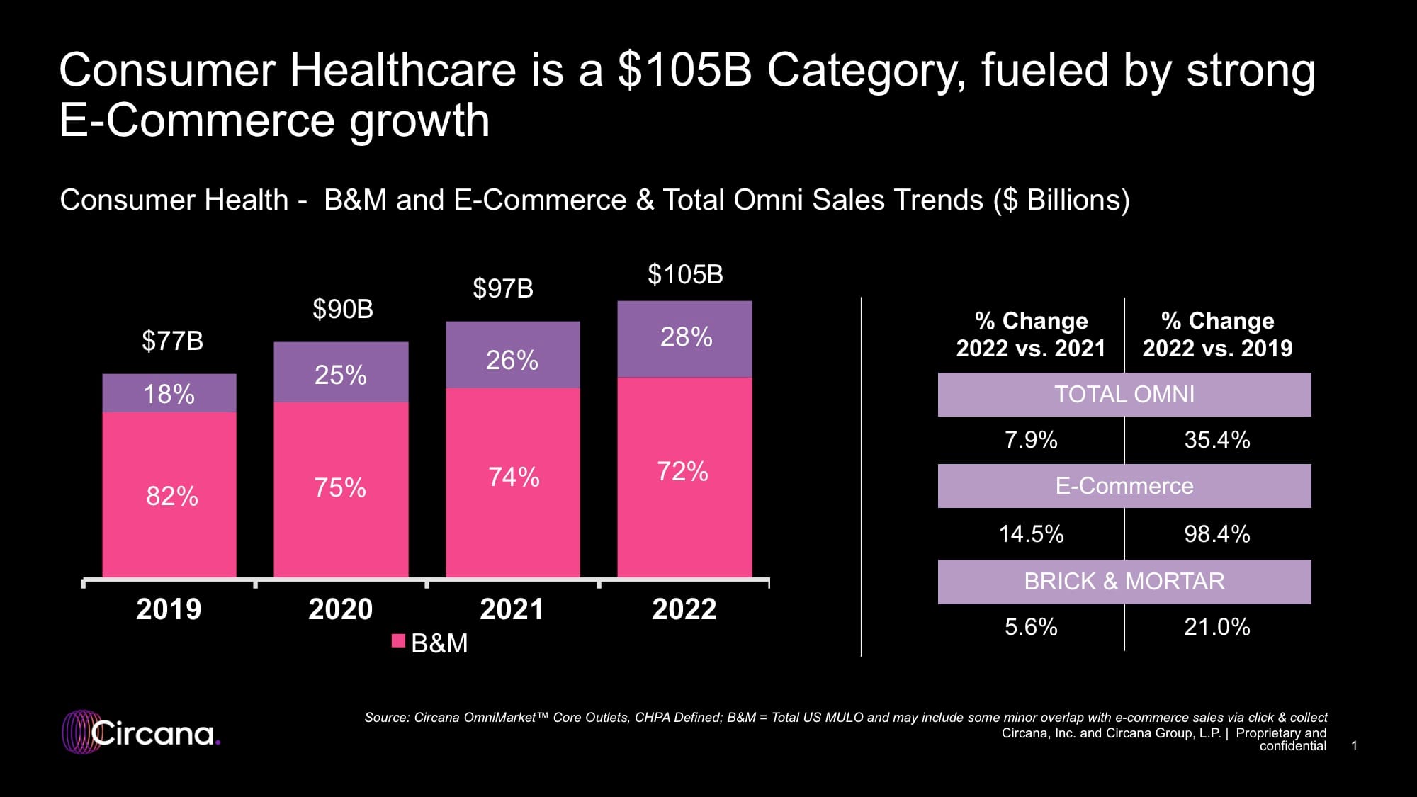 The consumer health care category has been a reliably strong performer throughout the pandemic years. According to Circana data, it outpaced inflation to grow from a $77 billion category in 2019 to $105 billion in 2022. E-commerce sales have been a major driver of that growth, nearly doubling over that time.