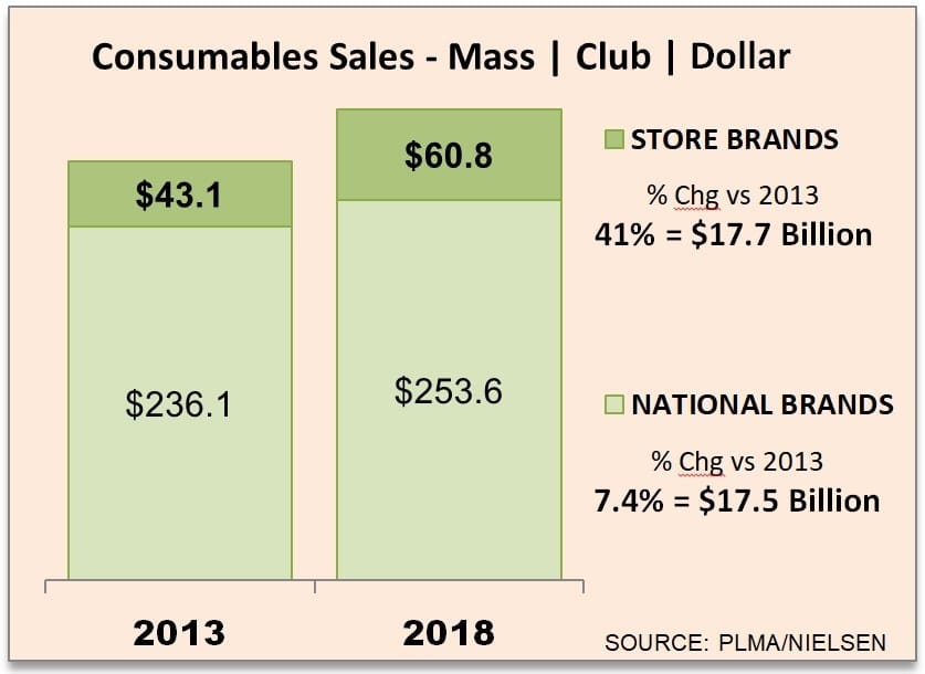 The gains in dollar and unit sales are generating significant market share increases for retailer brands in the mass channel as a result. Unit market share climbed to 23.2% in 2018, up from 18.5% in 2013. Meanwhile dollar market share advanced to 19.3% in 2018, up from 15.5% in 2013.