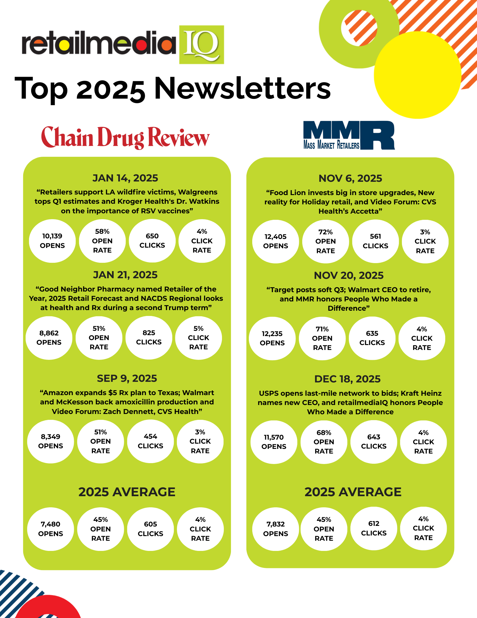 Holiday schedule note: The retailmediaIQ office will be closed from December 24 through January 5. During that period, our teams will pause regular operations. The following editions of the Chain Drug Review and Mass Market Retailers newsletters will be published the week of our return.