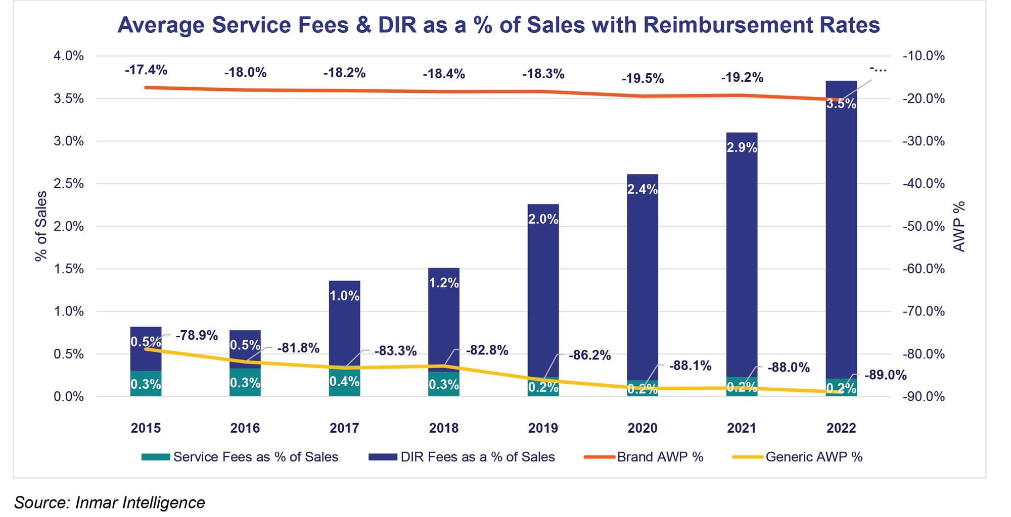 According to Inmar data, direct and indirect remuneration (DIR) fees averaged 3.5% of total sales in 2022. In 2015 and 2016 they were 0.5% of total sales. The intention was for DIR to be about quality and value-based patient care, but the result has been transferring pharmacy profits to PBMs. At the same time average reimbursement rates have declined.