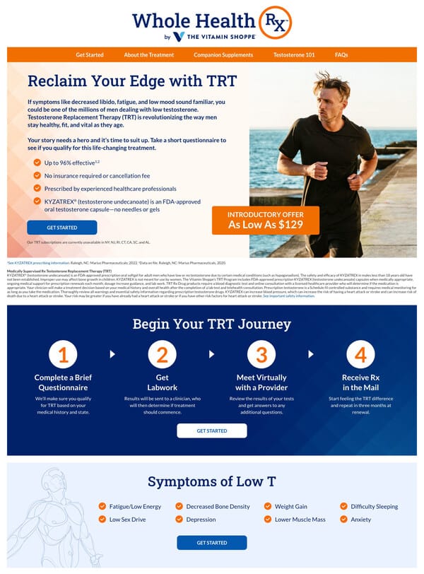Lee Wright, CEO of The Vitamin Shoppe, commented, "Men's health and testosterone support has been a category of growing interest to our customers, so we're especially pleased to now offer the highly effective and easy-to-use KYZATREX prescription medication to Whole Health Rx patients who can benefit from TRT. Our mission is to grow Whole Health Rx into a full-service health solution provider that can meet more of our customers' wellness needs, building on our strategic partnership with WellSync's innovative telehealth platform and expert network of healthcare professionals and pharmacies. As a pioneer in the wellness space since 1977, The Vitamin Shoppe is uniquely positioned to unite pharmaceutical interventions, such as TRT, with our unmatched expertise in nutrition support and whole-body health."