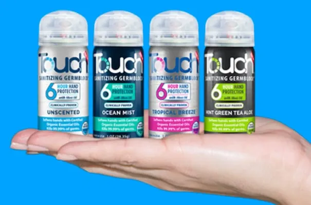 Touch Sanitizing Germ Block spray comes in four scents — Ocean Mist, Tropical Breeze, Mint Green Tea Aloe and Unscented — and carries a suggested retail price of $5.99.