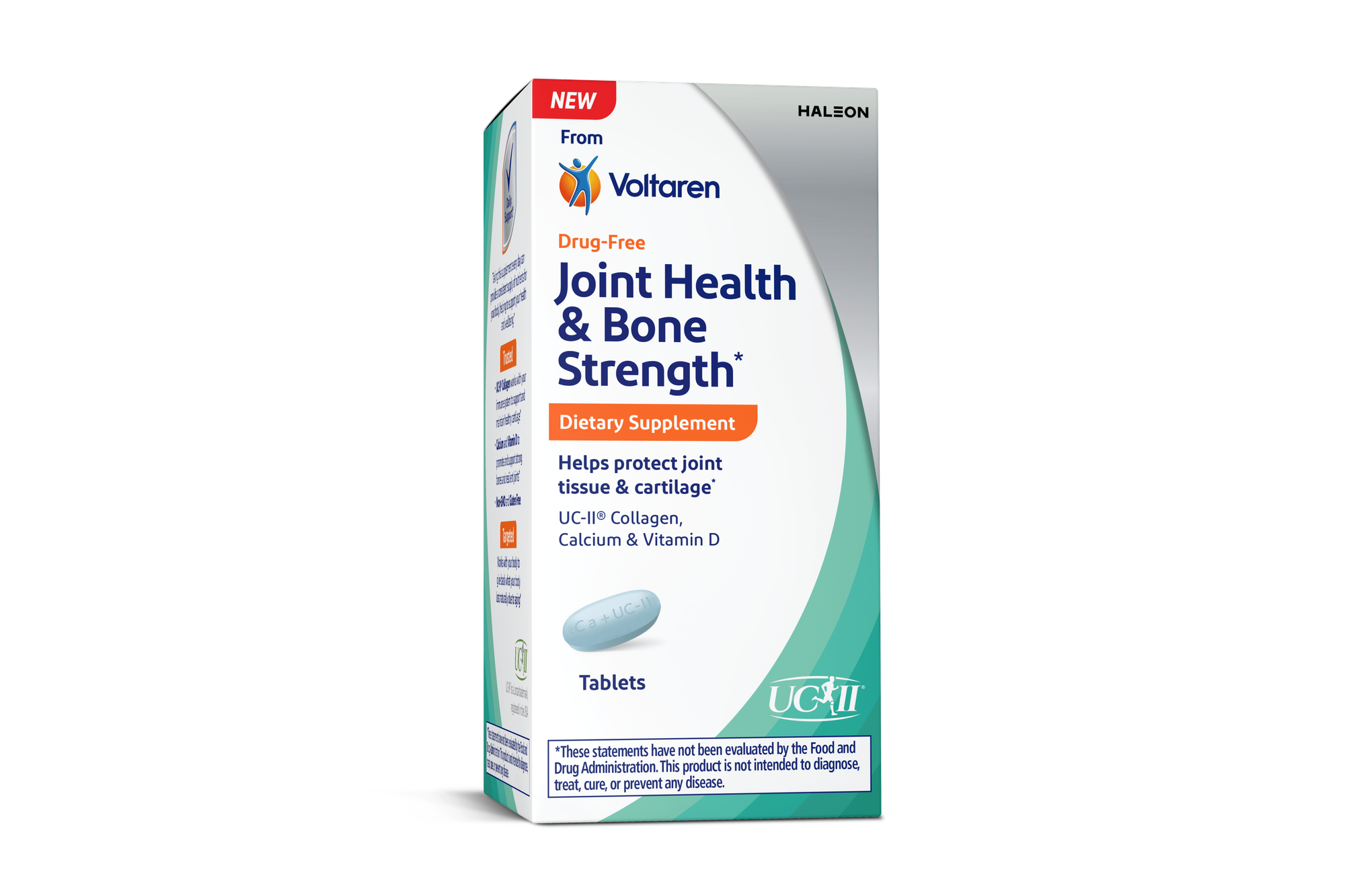 Joint Health & Bone Strength dietary supplement from Voltaren proactively helps keep joints and bones healthy and resilient with UC-II collagen, calcium and vitamin D to protect joint tissue and cartilage, so the user can stay on the go.