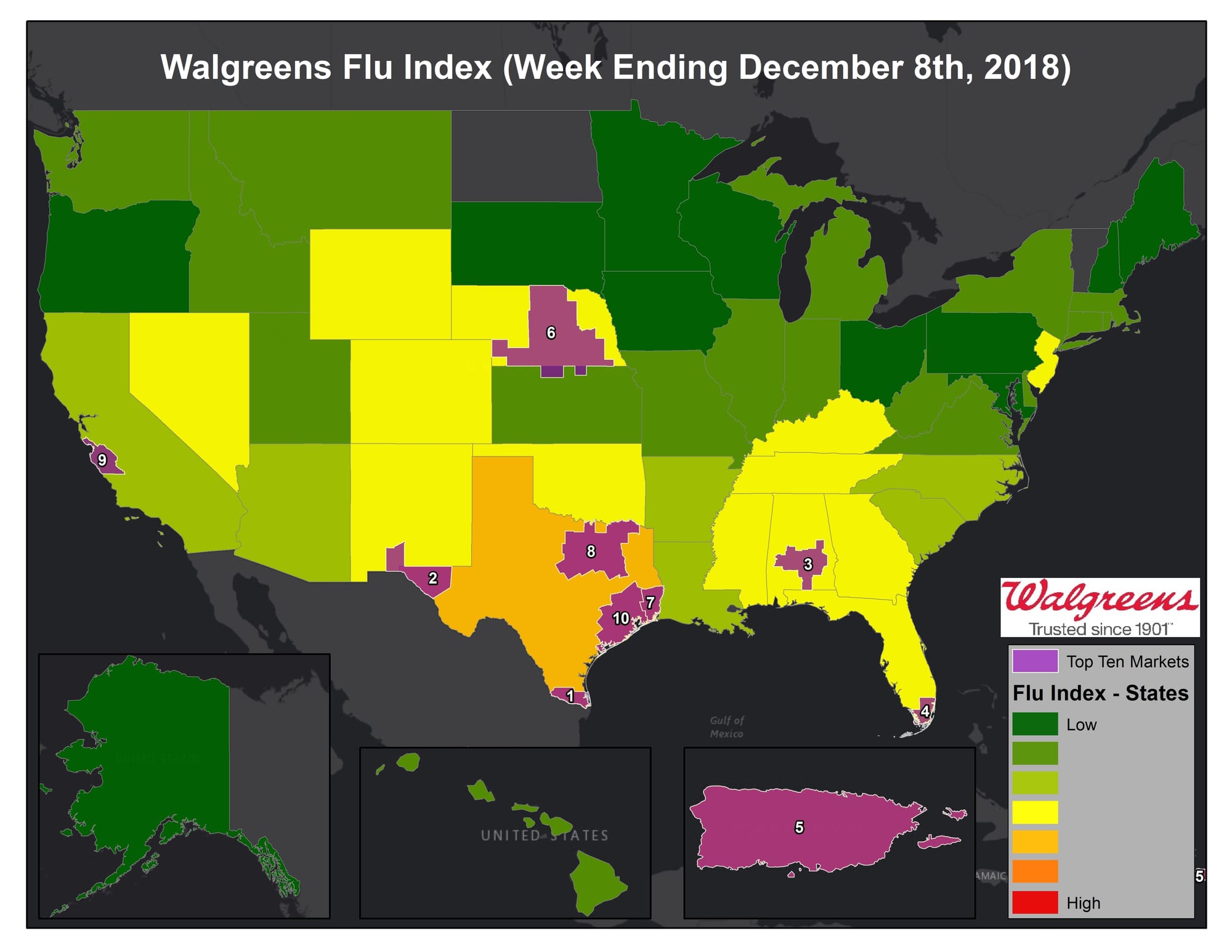 DEERFIELD, Ill. — With holiday travel around the corner and flu activity on the rise in many parts of the country, Walgreens has launched its first Flu Index for the 2018-2019 flu season. The Walgreens Flu Index, now in its fifth season, is a weekly report ranking the top markets and states for flu activity in the U.S., including Puerto Rico. It also ranks the top markets and states showing the largest increases in activity week over week.