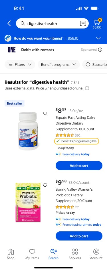- Customers can also filter search results to include benefits-eligible items, streamlining and simplifying the shopping journey. For those shopping in-store, benefits-eligible badging will show up when scanning items in the Walmart app.