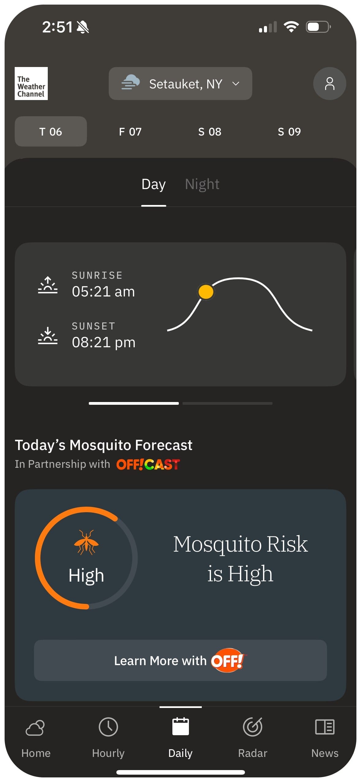 - The OFF!Cast tool will also be visible in The Weather Channel app’s new experience on iOS. Check out the Daily tab and Outdoor Activity tabs for camping, hiking, golf and gardening for an at-a-glance risk level – low, medium, high, very high, severe – of mosquito activity based on local weather conditions for today and the days ahead.