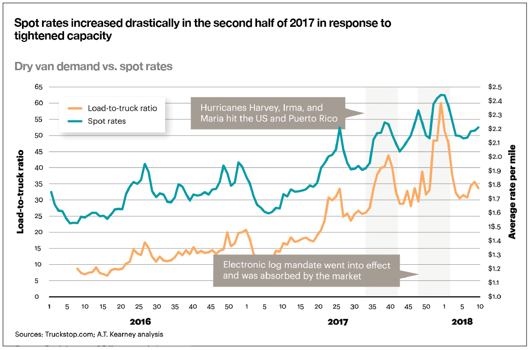 Meanwhile, capacity is tight. Critical events in 2017 included hurricanes and new mandates for electronic logging devices in trucks. And fundamentally, it’s difficult for supply of trucking capacity to expand to meet this higher sustained GDP growth because of a driver shortage that has been years in the making. With unemployment low, and driver poaching between carriers high, carriers struggle to attract and retain recruits. Carriers have raised driver compensation by 15% to 18% since 2013, according to the American Trucking Association — still not enough to attract new drivers in sufficient numbers.