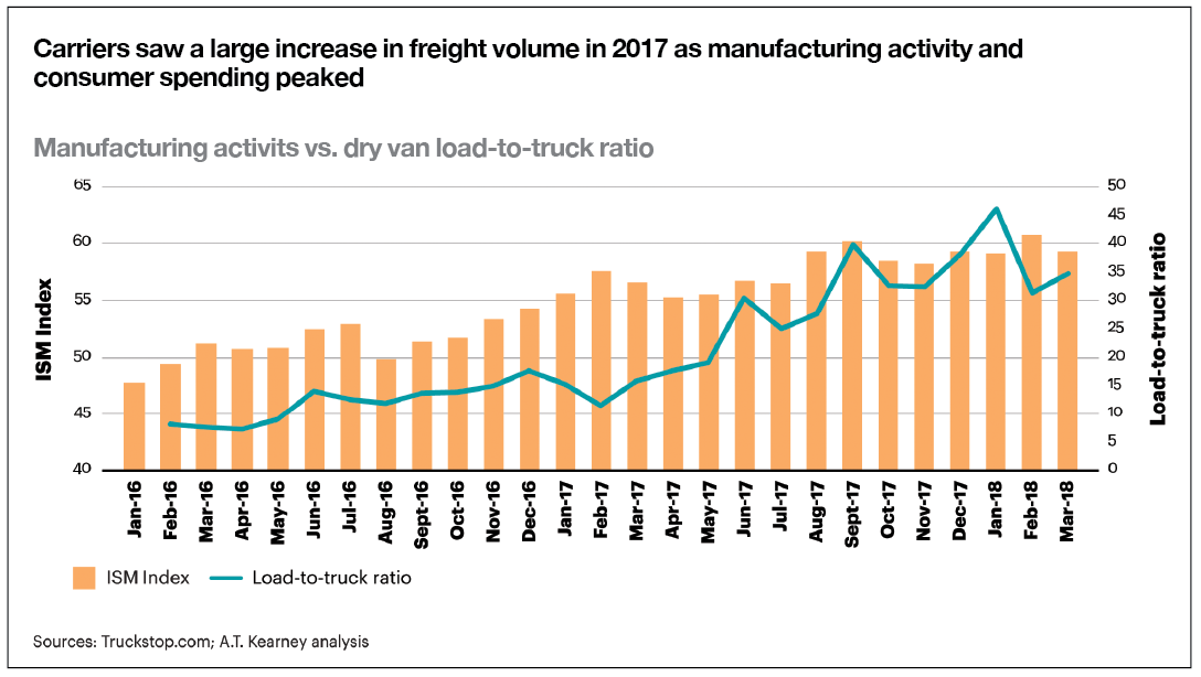 In 2017, dedicated trucking costs increased by 9.5% over the previous year. These higher prices, A.T. Kearney’s “2018 State of Logistics Report” showed, resulted from increases in freight volume and restrained supply. With a rise in manufacturing activity and consumer spending, the economic momentum that lifted gross domestic product in the United States by 2.9% in 2017 is likely to continue.
